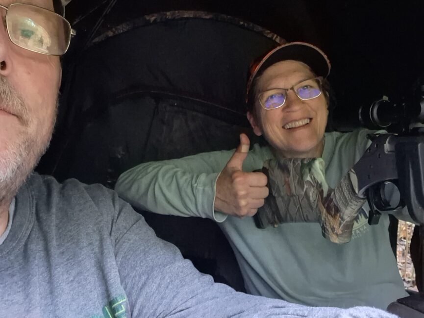 As you might imagine, I’m feeling less than ready for such an endeavor as hunting a bear.  Knowing I would have my husband as my personal guide and outfitter in the blind with me brings some peace of mind.  Gary took me to the shooting range a few times where I practiced shooting at 50 yards with a .30-06.  For my final practice session, John Jones offered to take me to the range just before my arrival to Bear Camp 2025, as Gary was already in the U.P. with his hunters in full swing.  Thanks John!