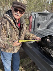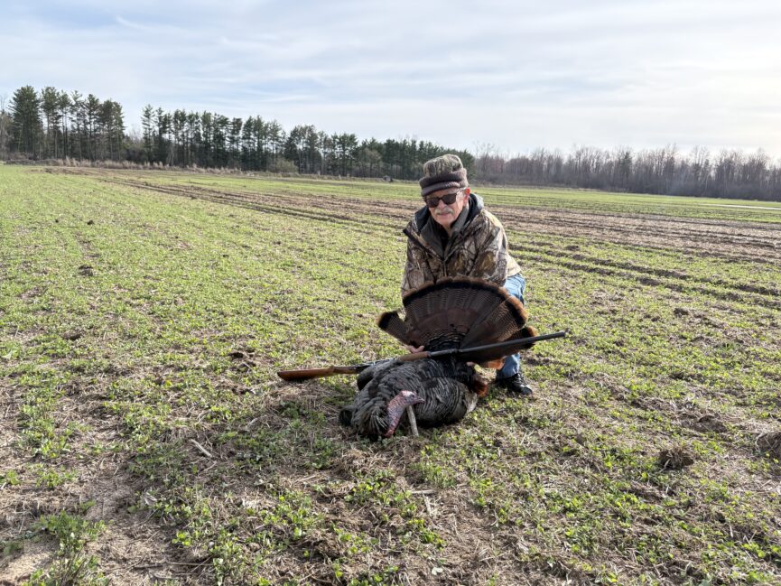 First up was the patriarch of the family, Richard Compeau, age 85. This was actually his first turkey, though his hunting experience of other wildlife has been an important part of his life from his early years. On this day, Richard was sitting in a tent blind with his son, Greg. Set up in a big field, with no decoys and no turkey calls, they patiently waited, “old style,” is how Richard described it. Before long, they saw a tom, but in the distance just to the south of the berm. Richard was hunting with his 20-gauge Springfield Savage he’d purchased in Massachusetts where he was stationed in the navy in 1958. He was offered a larger gun for the hunt but preferred his “60-year-old gem” as it was much more comfortable being lighter weight. In those days, he’d often hunted pheasant and a lot of small game. He’d tried other guns over the years but always came back to his 20-gauge. He’d also enjoyed shooting clay pigeons from time to time. This skill would come in handy when a second tom came onto the scene. The plan was for Richard to await the directive from his son Greg, just one word… “Shoot!” And so it was that Richard responded in kind, with the first shot hitting a wing, causing tom to veer to the left before taking flight. Richard immediately got off a second shot, and down tom went, much like a clay pigeon!