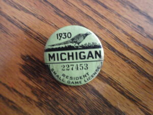 The 1930 Michigan small game license was a ceramic and brass pin featuring a rooster pheasant, the king of small game.