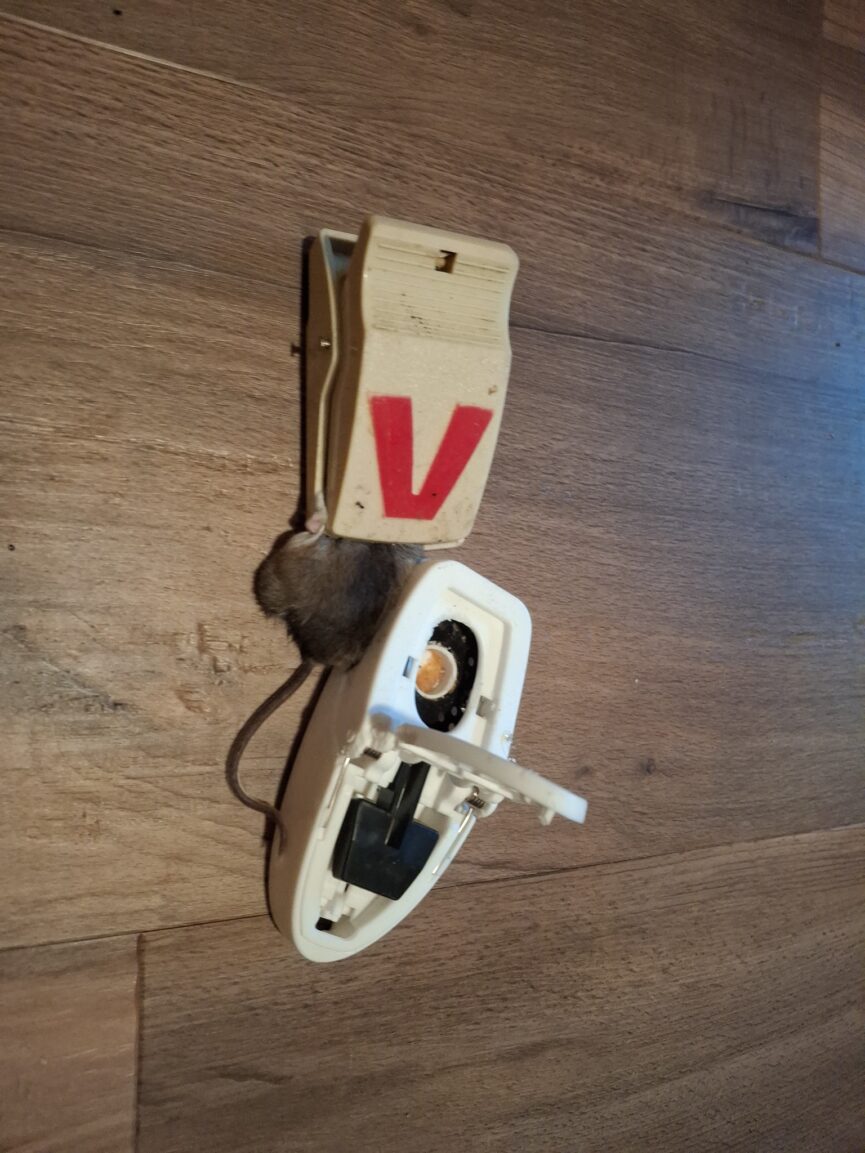 Anyhow, when I woke up for the day, I was puzzled when the trap was no longer near the oven. As I scanned the area, I saw that it had moved 5 feet diagonally across the room to the second mouse trap. Upon closer inspection, I realized that this was a suicidal mouse. The first trap, “Jaws,” had trapped one of the mouse’s legs, so for a time he was mobile.